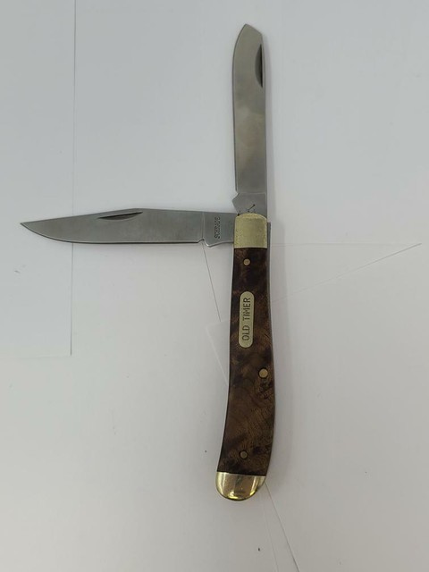 Schrade old timer senior stockman yellow delrin folding pocket knife 8oty. New new old timer 3 piece stainless steel folding knife set with etched wildlife scenes. Old timer is one of the brands that made schrade the name it is today. All three knives are easily stored in a custom gift tin.