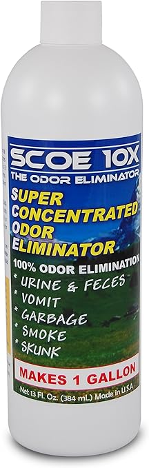 Scoe 10x will permanently eliminate any urine feces vomit sweat skunk spray meat fish smoke or fuel odor. Scoe 10x is a stunningly effective odor eliminator. Scoe 10x use instructions. However in the event you need a refund please follow these three simple steps.