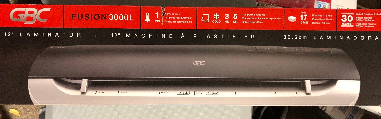 This item swingline gbc 1703075 fusion 3000l laminator 12 inch wide 5mil maximum document thickness gbc thermal laminator machine fusion 3100l 12 inch 1 min warm up 3 7 mil with 30 ezuse laminating pouches 1703076af. Swingline provides durable and reliable office supplies to help you succeed.