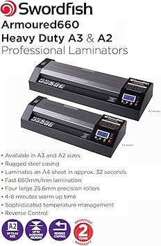40191 combining design flair with functionality the swordfish 330lr compact laminator laminates documents up to a3 size 330mm feed entry width and can be used for everyday use in the home or office.